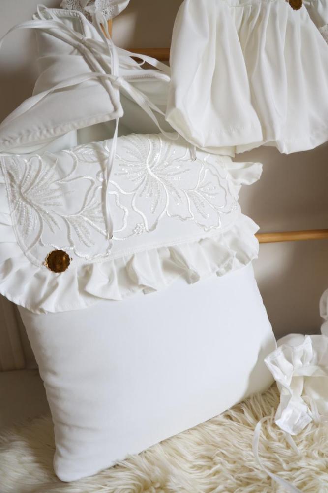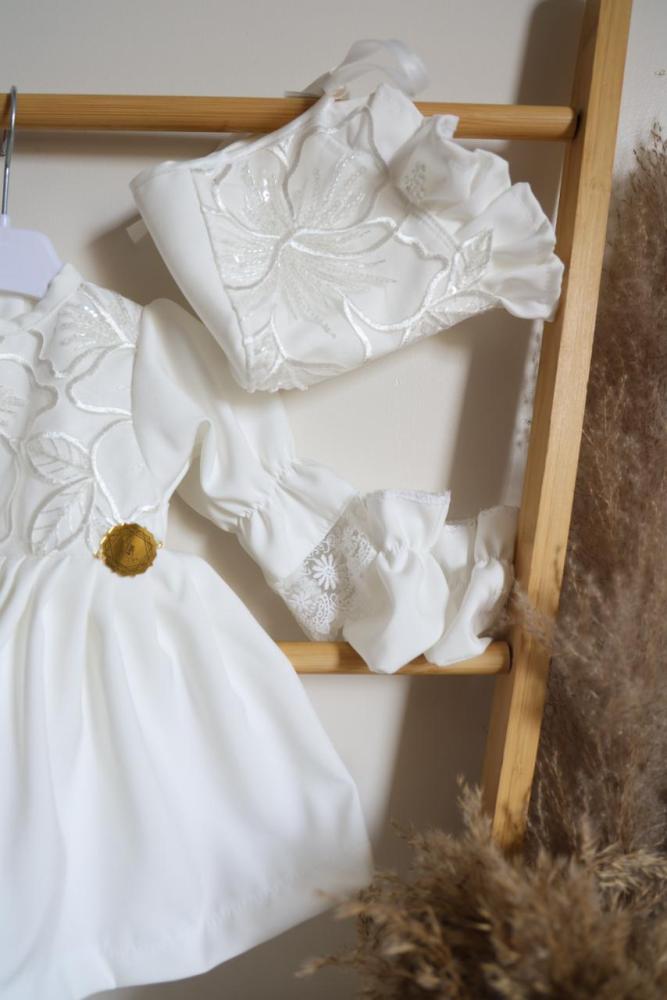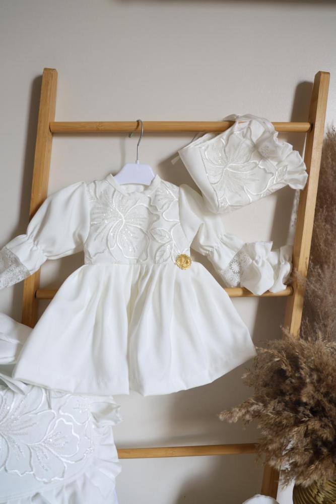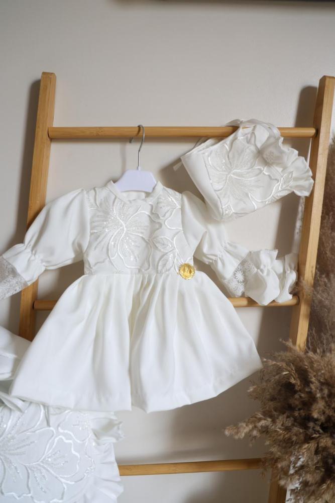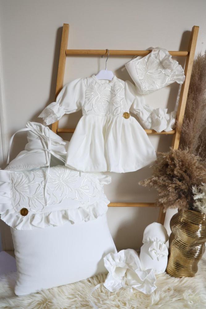 طقم مكون من فستان ومدس وقبعه وشراب وبيت رضاعه