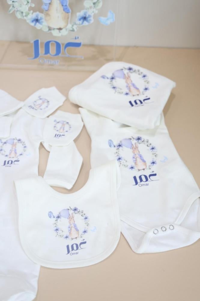 أضف لمسة من الأناقة والرقي مع هدايا بيبي حديث الولادة بطقم الأكريليك الفاخر من San-Prints. يأتي في صندوق مميز من الأكريليك يحتوي على قطع أساسية للمولود مصنوعة من قطن تركي ناعم يمكن تخصيصها بتصميم اسم الطفل أو رسومات حسب الطلب. مثالية كهدية مميزة للمولود الجديد